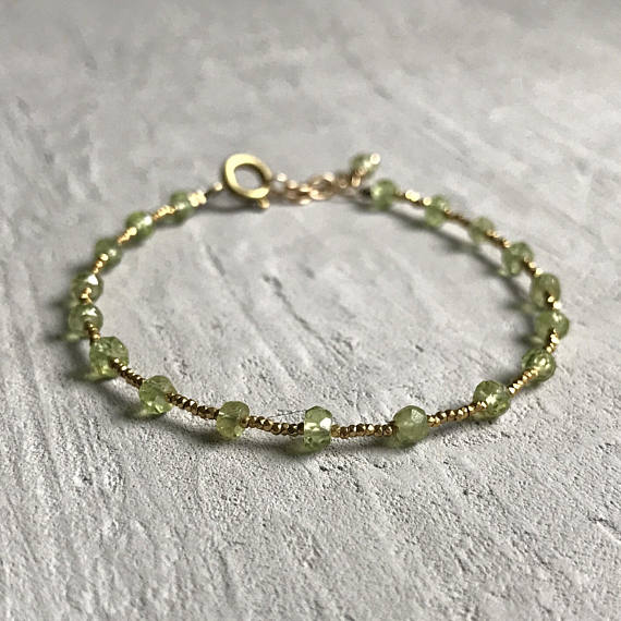 At a Great Price24k gold Plated Bridesmaid Jewelry Gold Helling 3-4mm stacking Green peridot Bracelet Rondelle, Faceted 7" for mens, womens, gf, bf & Adult.