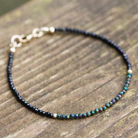 24k gold Plated Dainty Slave Loose Gold Helling 2mm stacking Multi Natural Black Spinel an Black Opal Bracelet Round, Smooth 7" for mens, womens, gf, bf & Adult.
