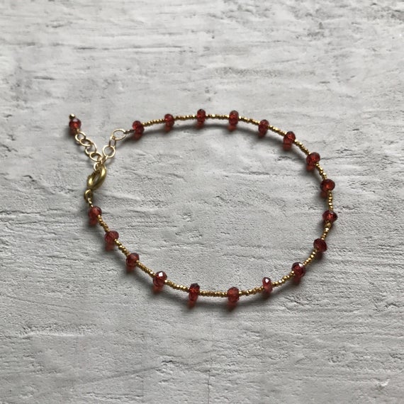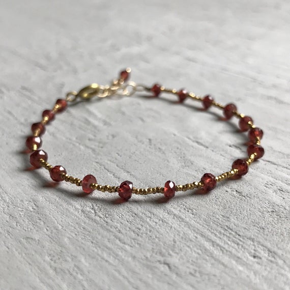 24k gold Plated Dainty Slave Loose Gold Helling 3-4mm stacking Red mozambique garnet Bracelet Rondelle, Faceted 7" for mens, womens, gf, bf & Adult.