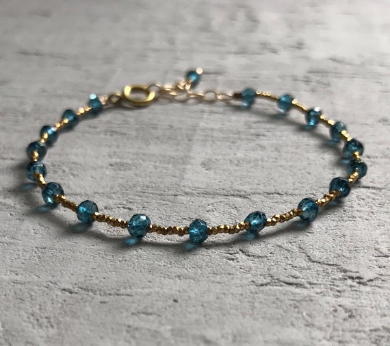 At a Great Price24k gold Plated good luck gift Gold Helling 3-4mm stacking Blue london blue topaz Bracelet Rondelle, Faceted 7" for mens, womens, gf, bf & Adult.