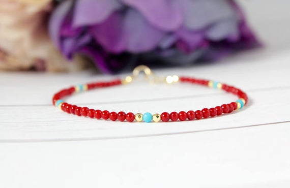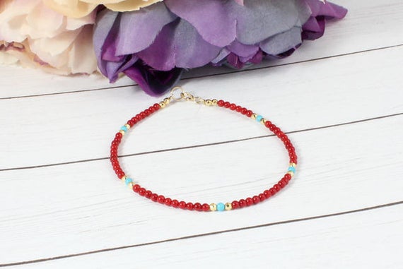 At a Great Price24k gold Plated Handmade Beaded Gold Helling 2mm stacking Red Red Coral Bracelet Round, Smooth 7" for mens, womens, gf, bf & Adult.