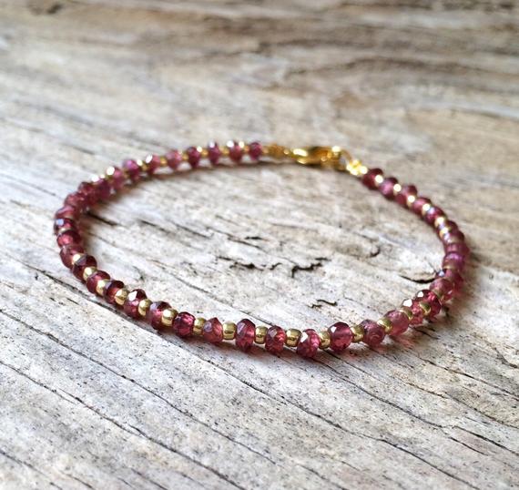 At a Great Price24k gold Plated top quality Gold Helling 3-4mm stacking Red Garnet Bracelet Rondelle, Faceted 7" for mens, womens, gf, bf & Adult.