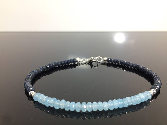 At a Great Price925 sterling Silver Anniversary Gift Silver Helling 4-5mm stacking Blue & Aqua Sapphire and Aquamarine Bracelet Rondelle, Faceted & Smooth 7" for mens, womens, gf, bf & Adult.