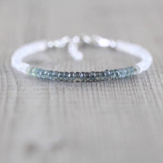 At a Great Price925 sterling Silver Anxiety Gemstone 3MM stacking Multi Moss Aquamarine & Rainbow Moonstone Bracelet Rondelle, Faceted 7" for mens, womens, gf, bf & Adult.
