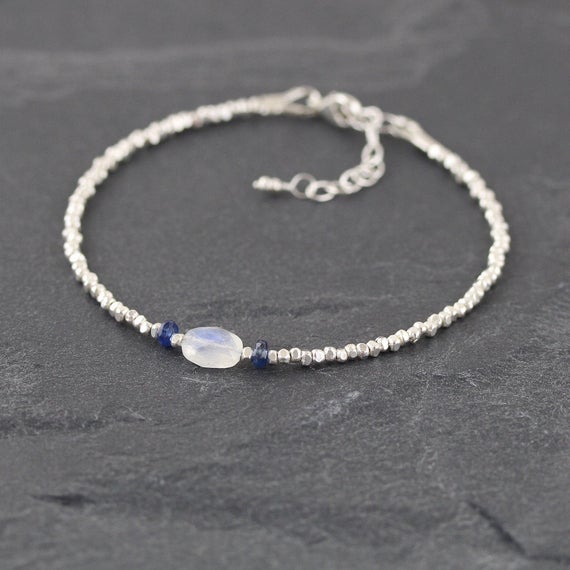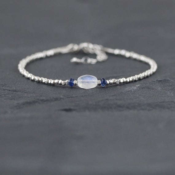 At a Great Price925 sterling Silver Anxiety Gemstone Silver Helling 6x8mm stacking Blue & White Rainbow Moonstone & Kyanite Bracelet Oval & Rondelle, Faceted 7" for mens, womens, gf, bf & Adult.
