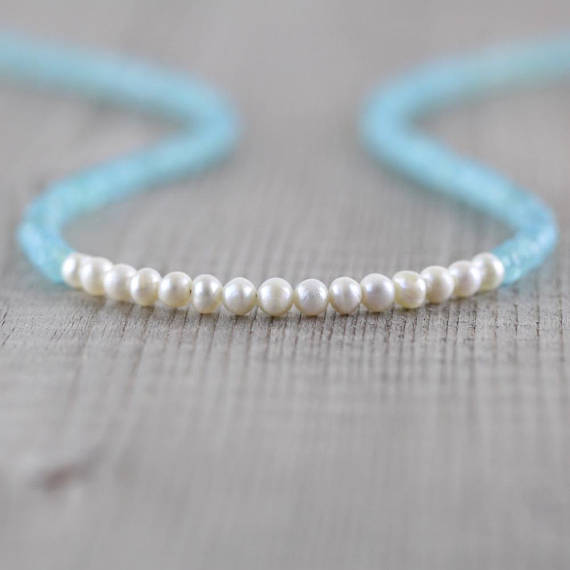 At a Great Price925 sterling Silver Anxiety Relief Calming 3.5mm stacking Blue & White Freshwater Pearl & Aqua Chalcedony Necklace Round & Rondelle, Faceted & Smooth 16" for mens, womens, gf, bf & Adult.