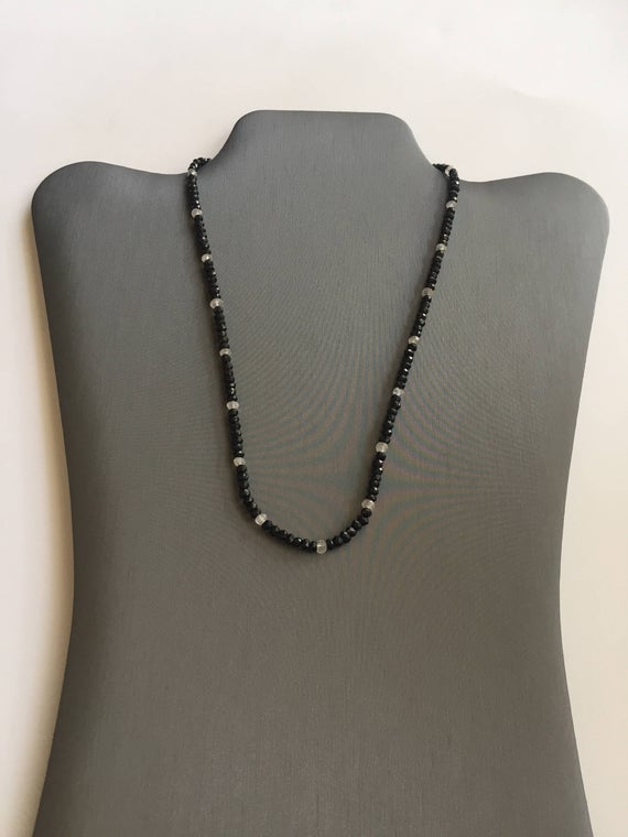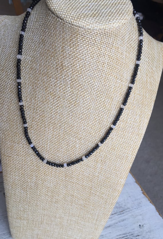 At a Great Price925 sterling Silver Anxiety Relief Calming 3mm stacking Black & White Black Spinel & Moonstone Necklace Rondelle, Faceted 20" for mens, womens, gf, bf & Adult.