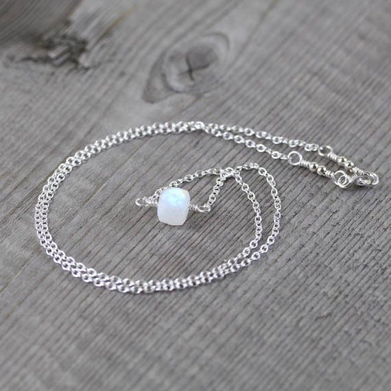 At a Great Price925 sterling Silver Anxiety Relief Calming 6mm stacking White Rainbow Moonstone Necklace Cube, Faceted 16" for mens, womens, gf, bf & Adult.