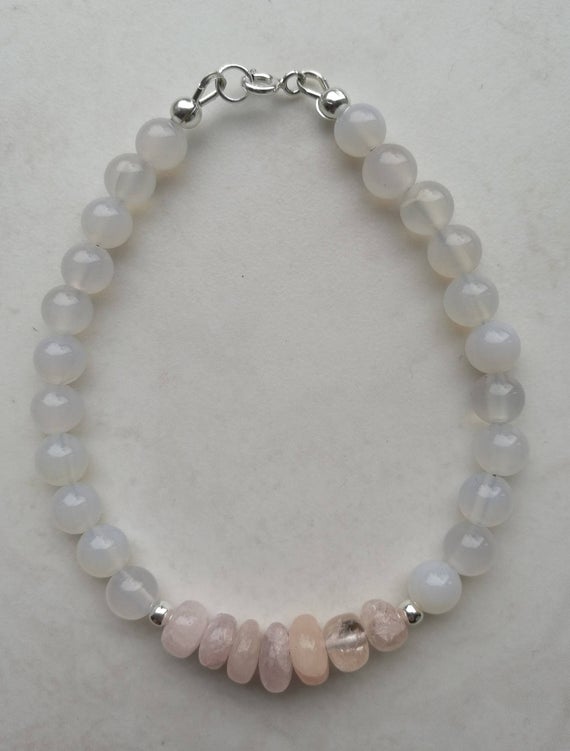 At a Great Price925 sterling Silver Anxiety Relief Calming Silver Helling 3-5mm stacking Pink & White Morganite, White agate Bracelet Round & Rondelle, Smooth 7" for mens, womens, gf, bf & Adult.
