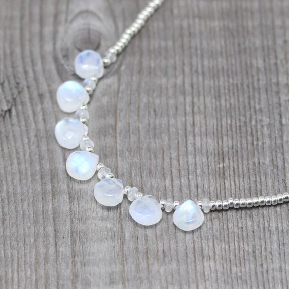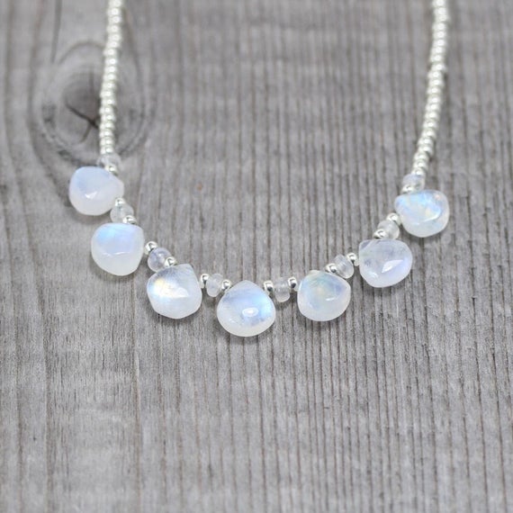 At a Great Price925 sterling Silver Anxiety Relief Calming Silver Helling 3mm stacking White Rainbow Moonstone, Miyuki Seed Necklace Heart & Rondelle, Faceted 16" for mens, womens, gf, bf & Adult.