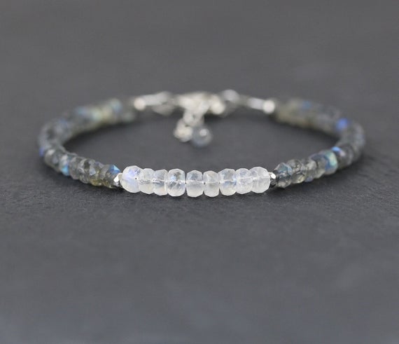 925 sterling Silver Anxiety Relief Calming Silver Helling 4-4.5mm stacking Gray Labradorite & Rainbow Moonstone Bracelet Rondelle, Faceted 7" for mens, womens, gf, bf & Adult.