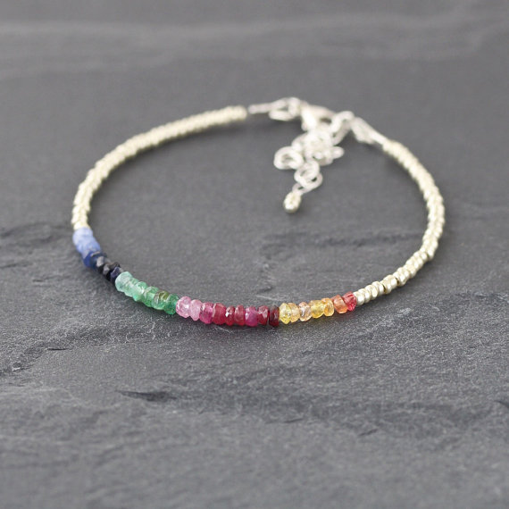 925 sterling Silver Artisan Loose 3-3.5mm stacking Multi Blue & Yellow Sapphire, Emerald and Ruby Bracelet Rondelle, Faceted 7" for mens, womens, gf, bf & Adult.