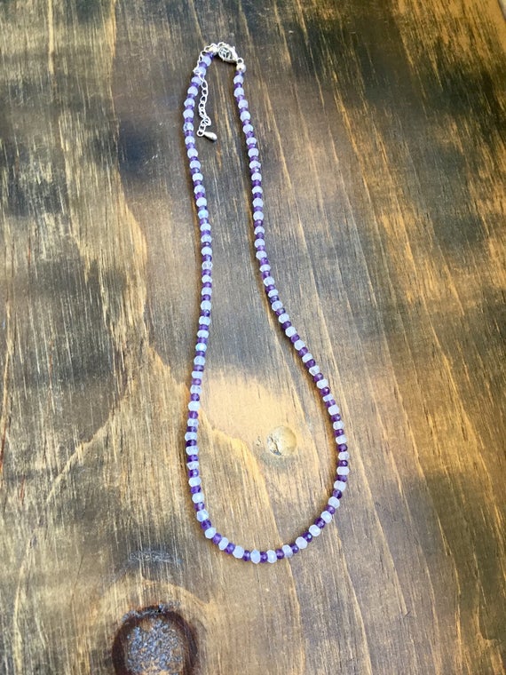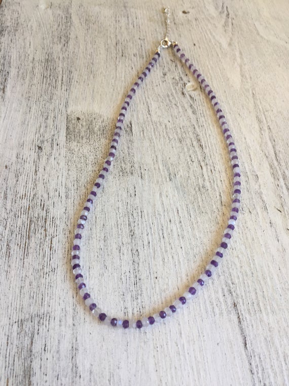 925 sterling Silver Artisan Loose 3-4mm stacking Purple & White Amethyst & Moonstone Necklace Rondelle, Faceted 17" for mens, womens, gf, bf & Adult.