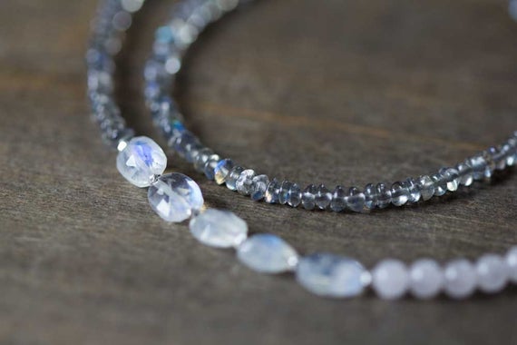 At a Great Price925 sterling silver Artisan Loose 3-7mm Multi Colour Rose Quartz & Labradorite & Rainbow Moonstone stacking Necklace Rondelle, Smooth 16inch for mens, womens, gf, bf and adults.