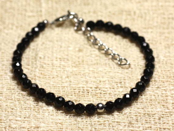 At a Great Price925 sterling Silver Artisan Loose Silver Helling 4mm Stracking Black Black Onyx Bracelet Round, Faceted 7" for mens, womens, gf, bf & Adult.