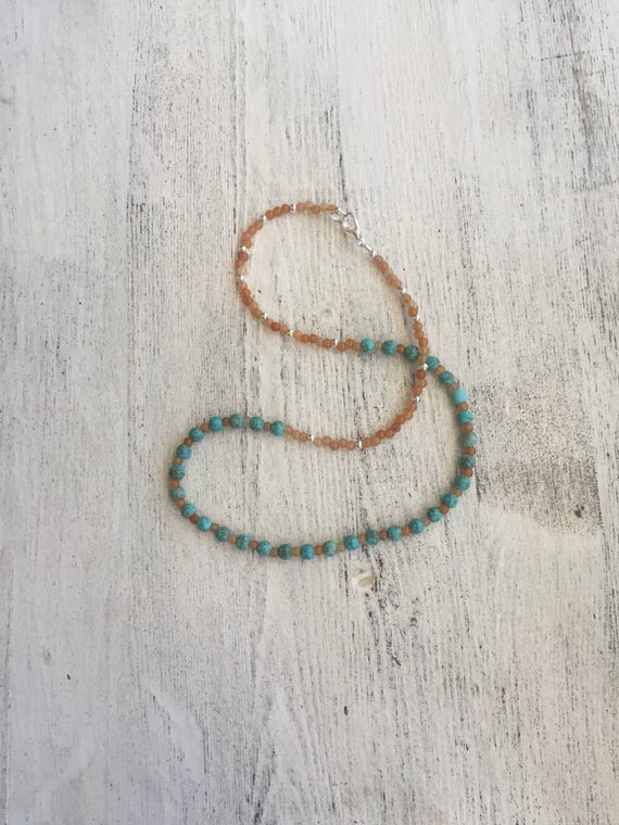 925 sterling Silver Blush Jewelry Silver Helling 3-4mm stacking Blue & Orange Magnesite, Aventurine Necklace Round, Smooth 18" for mens, womens, gf, bf & Adult.
