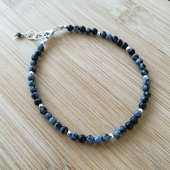 At a Great Price925 sterling Silver Blush Jewelry Silver Helling 3mm stacking Multi Snowflake Obsidian Bracelet Round, Smooth 7" for mens, womens.