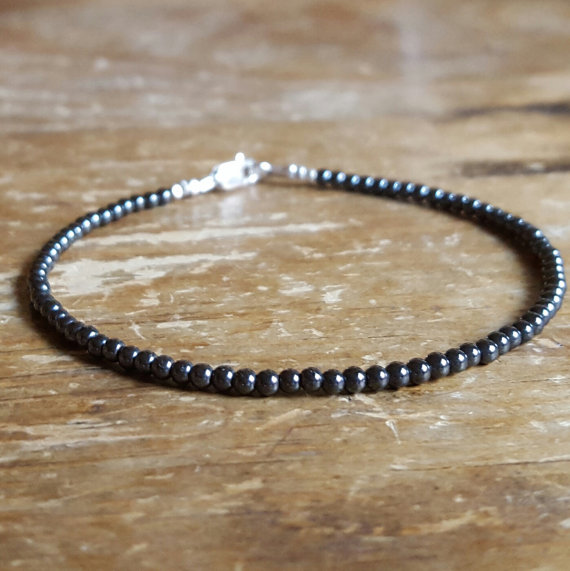 925 sterling silver Bridesmaid Jewelry 2mm black Hematite stacking Bracelet Round, Smooth 18cm for mens, womens, gf, bf and adults.