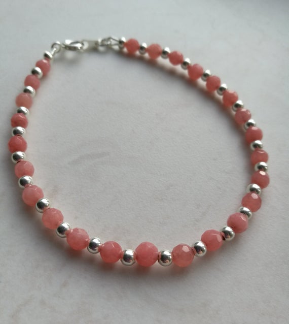925 sterling Silver Bridesmaid Jewelry Silver Helling 3-4mm stacking Pink Strawberry Pink Quartzite Bracelet Round, Smooth 7" for mens, womens, gf, bf & Adult.