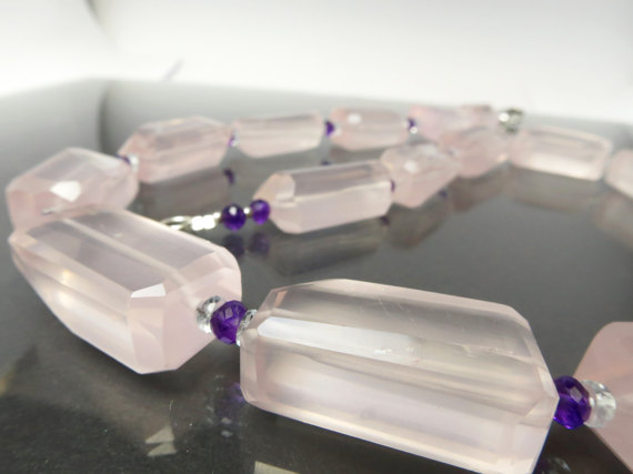 At a Great Price925 sterling Silver chakras simple 26x15-25x15mm stacking Pink rose quartz & aquamarine Necklace Rectangle, Faceted 17" for mens, womens.