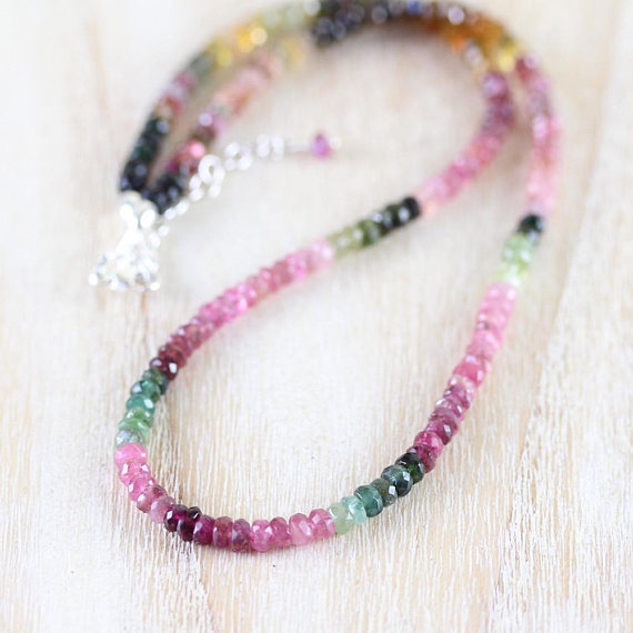 At a Great Price925 sterling Silver chakras simple 3.5-4mm stacking Multi Multi Colour Tourmaline Necklace Rondelle, Faceted 16" for mens, womens, gf, bf & Adult.