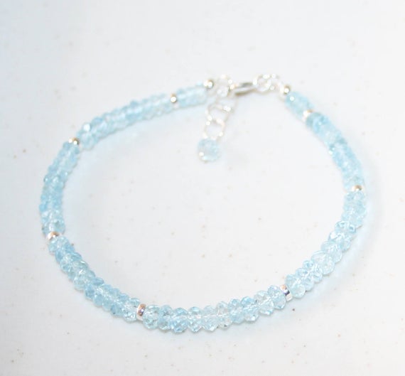 At a Great Price925 sterling Silver chakras simple Silver Helling 4mm stacking Aqua Natural Aquamarine Bracelet Rondelle, Faceted 7" for mens, womens.