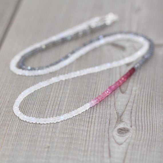 At a Great Price925 sterling Silver Empath Protection 3.5-4mm stacking Multi Ombre Ruby, Rainbow Moonstone & Labradorite Necklace Rondelle, Faceted 16" for mens, womens, gf, bf & Adult.
