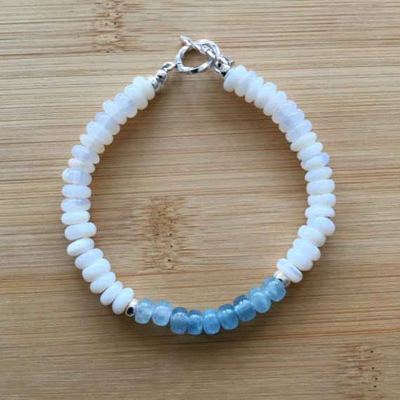925 sterling Silver Empath Protection Silver Helling 4-5mm stacking Multi Aquamarine and Mexican Opal Bracelet Rondelle, Smooth 7" for mens, womens.