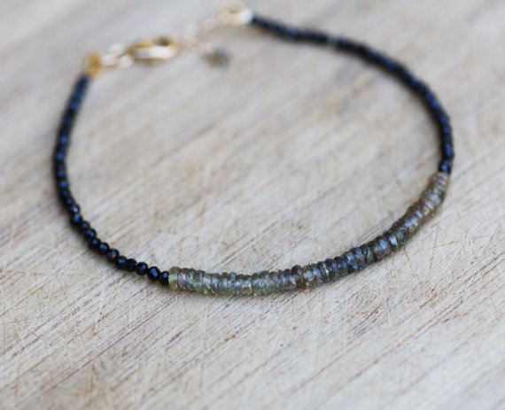 925 sterling Silver Galaxy Jewelry 2-3mm stacking Black & Gray Natural Black Spinel and Green to Champagne Sapphire Bracelet Round & Rondelle, Faceted 7" for mens, womens, gf, bf & Adult.