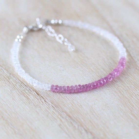 At a Great Price925 sterling Silver Galaxy Jewelry Silver Helling 3.5mm stacking Pink & White Pink Sapphire & Rainbow Moonstone Bracelet Rondelle, Faceted 7" for mens, womens, gf, bf & Adult.