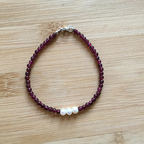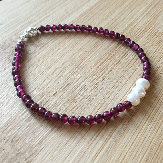 925 sterling Silver Grounding 2mm stacking Red Freshwater Pearl and Garnet Bracelet Round, Smooth 7" for mens, womens.