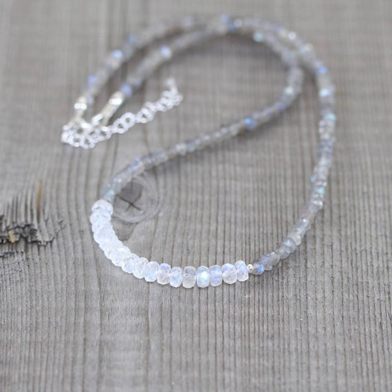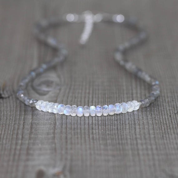 At a Great Price925 sterling Silver Grounding 3.5-4mm stacking Multi Rainbow Moonstone & Labradorite Necklace Rondelle, Faceted 16" for mens, womens, gf, bf & Adult.
