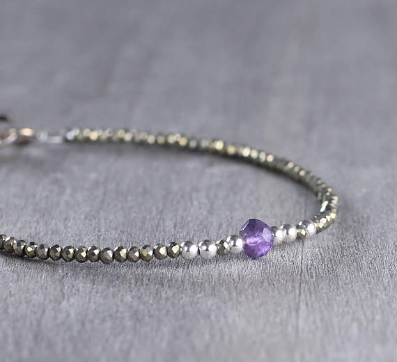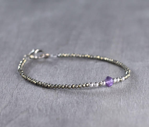 At a Great Price925 sterling silver Handmade Beaded 2.5-4mm Purple Amethyst & Pyrite stacking Bracelet Round, Faceted 18cm for mens, womens, gf, bf and adults.