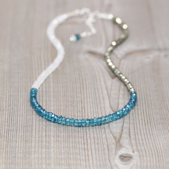 925 sterling Silver Handmade Beaded 3.5mm stacking Multi London Blue Topaz, Rainbow Moonstone & Pyrite Necklace Rondelle, Faceted 16" for mens, womens, gf, bf & Adult.