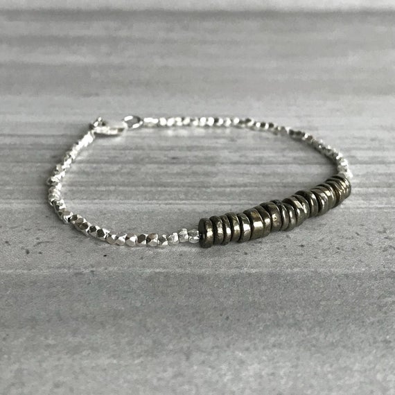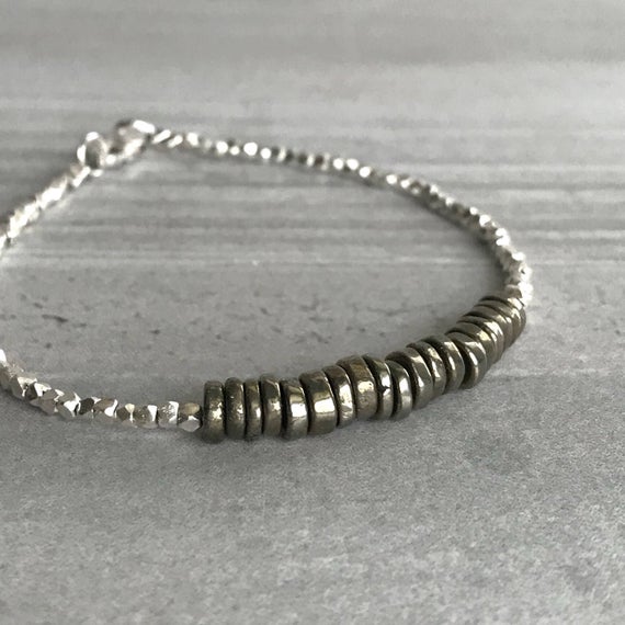 925 sterling silver Handmade Beaded 5mm Black Pyrite stacking Bracelet Rondelle, Smooth 18cm for mens, womens, gf, bf and adults.