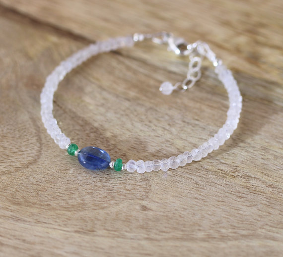 At a Great Price925 sterling Silver Handmade Beaded Silver Helling 3.5mm stacking Multi Kyanite, Zambian Emerald & Rainbow Moonstone Bracelet Rondelle, Faceted 7" for mens, womens, gf, bf & Adult.