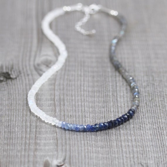 At a Great Price925 sterling Silver Jewelry Energy 3.5mm stacking Multi Blue Sapphire, Labradorite & Rainbow Moonstone Necklace Rondelle, Faceted 16" for mens, womens, gf, bf & Adult.