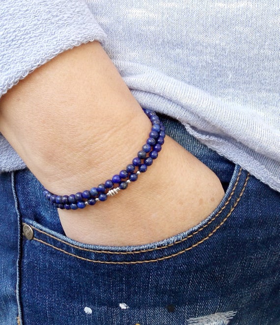 At a Great Price925 sterling silver love beach youth 4mm Blue Lapis Lazuli Stretchable Bracelet Round, Smooth 18cm for mens, womens, gf, bf and adults.