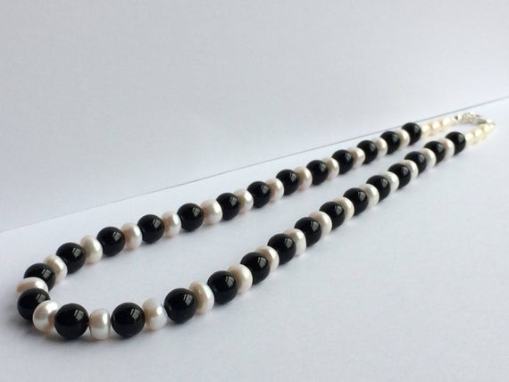 At a Great Price925 sterling Silver love beach youth Silver Helling 8mm stacking Black & White Black onyx and freshwater pearl Necklace Round & Rondelle, Smooth 17" for mens, womens, gf, bf & Adult.