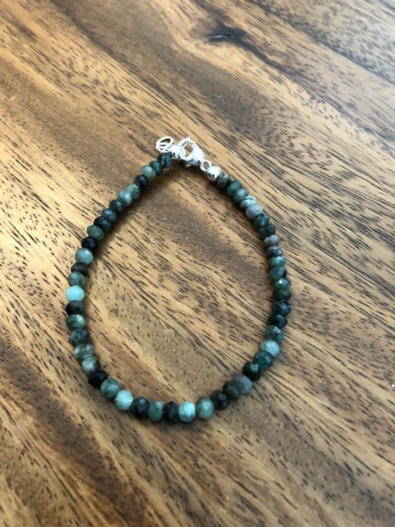 925 sterling Silver memorial gift 3-4mm stacking Green Emerald Bracelet Rondelle, Faceted 7" for mens, womens, gf, bf & Adult.