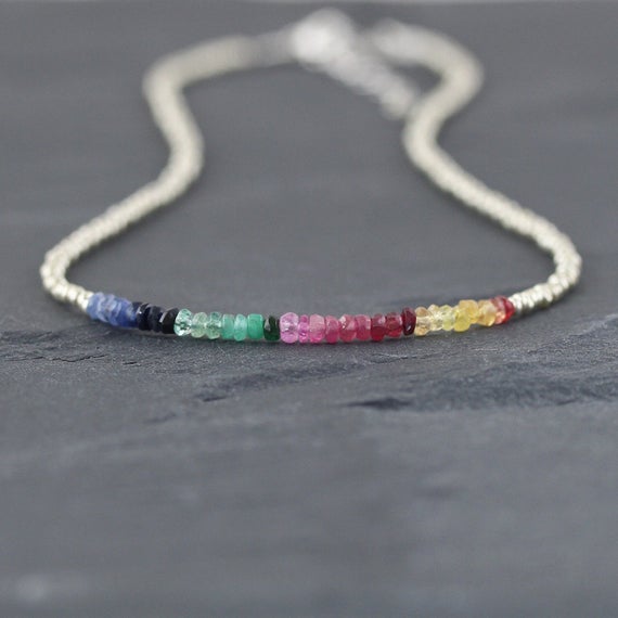 At a Great Price925 sterling Silver Personalized Gift Silver Helling 3.5mm stacking Multi Emerald, Ruby, Blue & Yellow Sapphire Necklace Rondelle, Faceted 16" for mens, womens, gf, bf & Adult.