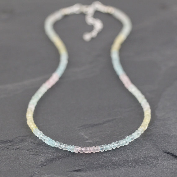 At a Great Price925 sterling Silver Rock Gift 3-3.5mm stacking Multi Ombre Aquamarine Morganite Necklace Round, Faceted 16" for mens, womens, gf, bf & Adult.