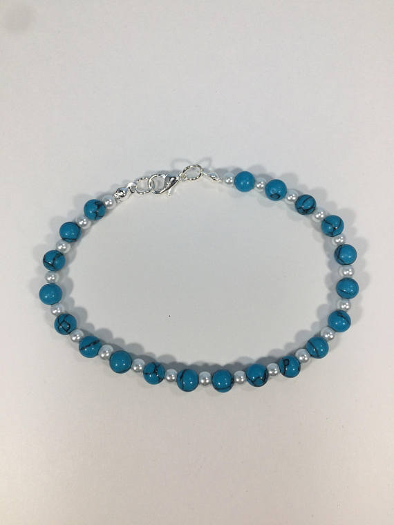 At a Great Price925 sterling Silver Rock Gift 4-5mm stacking Blue & White Turquoise Pearl Bracelet Round, Smooth 7" for mens, womens, gf, bf & Adult.
