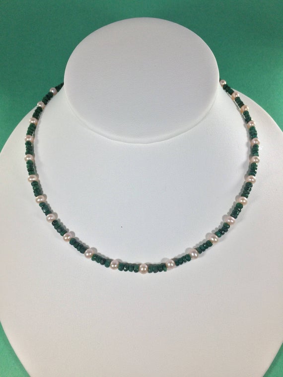 At a Great Price925 sterling Silver top quality 4-5mm stacking Green & White Pearl and Emerald Necklace Round & Rondelle, Faceted & Smooth 16" for mens, womens, gf, bf & Adult.