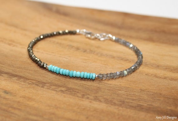 At a Great Price925 sterling Silver top quality Silver helling 3-3.5mm stacking Multi Turquoise, Labradorite & Pyrite Bracelet Rondelle, Faceted 7" for mens, womens, gf, bf & Adult.