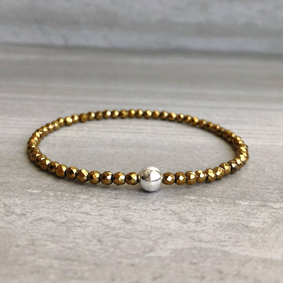 At a Great Price925 sterling silver Unique Wedding Gift 3-5mm Gold Hematite Stretchable Bracelet Round, Faceted 18cm for mens, womens, gf, bf and adults.