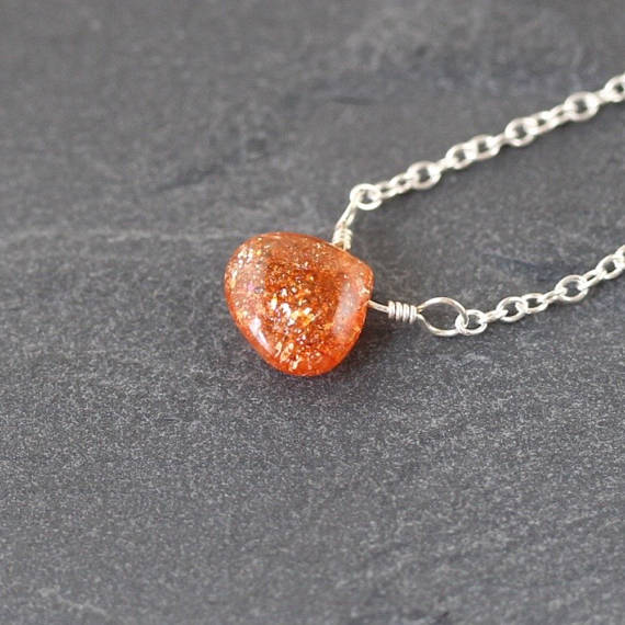 925 sterling Silver Unique Wedding Gift 9-10mm stacking Orange Sunstone Necklace Heart, Smooth 16" for mens, womens, gf, bf & Adult.