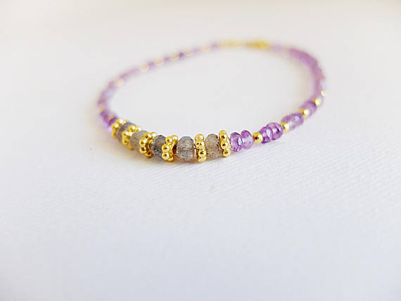 At a Great PriceAAA++ Rare Quality Amethyst jewelry sale! Amethyst and Labradorite rondelles ,Gold filled daisy spacers and spheres Amethyst labradorite stacking bracelet 3-4 mm Code- TJH90