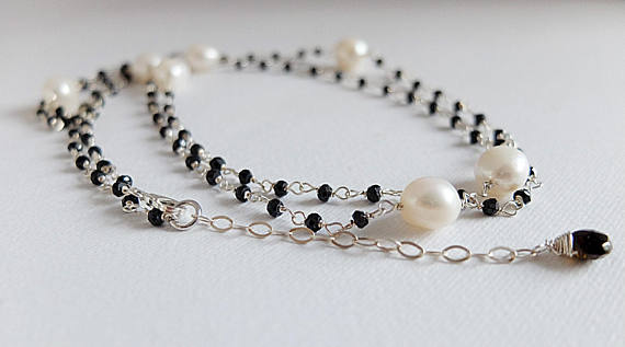At a Great PriceAAA++ Rare Quality Black Spinel rondelles freshwater white pearls,long necklace.Wire wrapped gemstone jewles,Rosary style long necklace black spinel pearl 3/4mm Code- TJH189