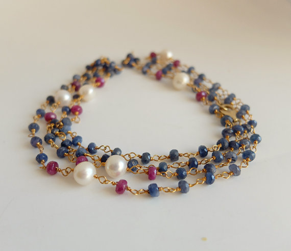 At a Great PriceAAA++ Rare Quality Blue sapphire,red Ruby,long Gold filled gem necklace.Wire wrapped gemstone jewels,rosary style sapphire and Ruby long Gold filled necklace 3/4 mm Code- TJH145